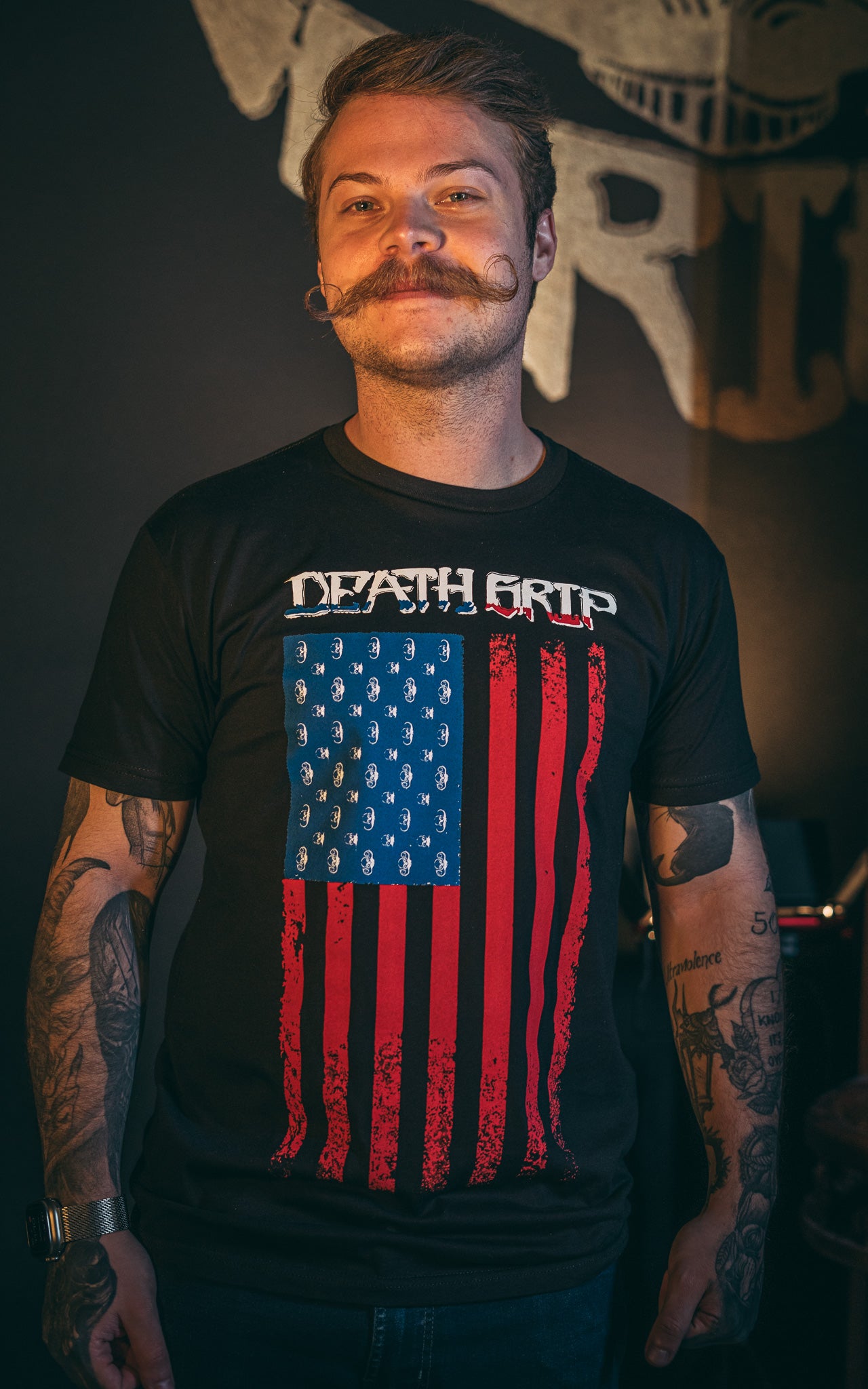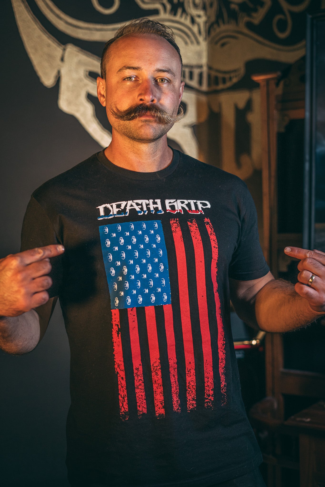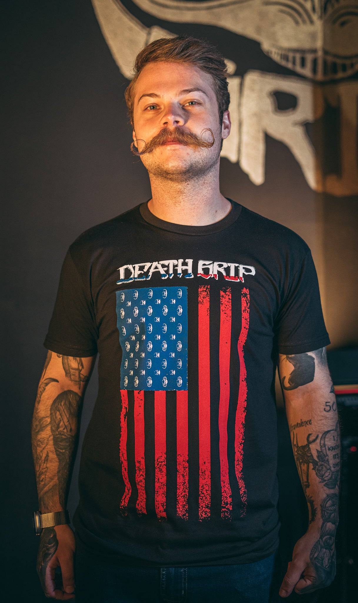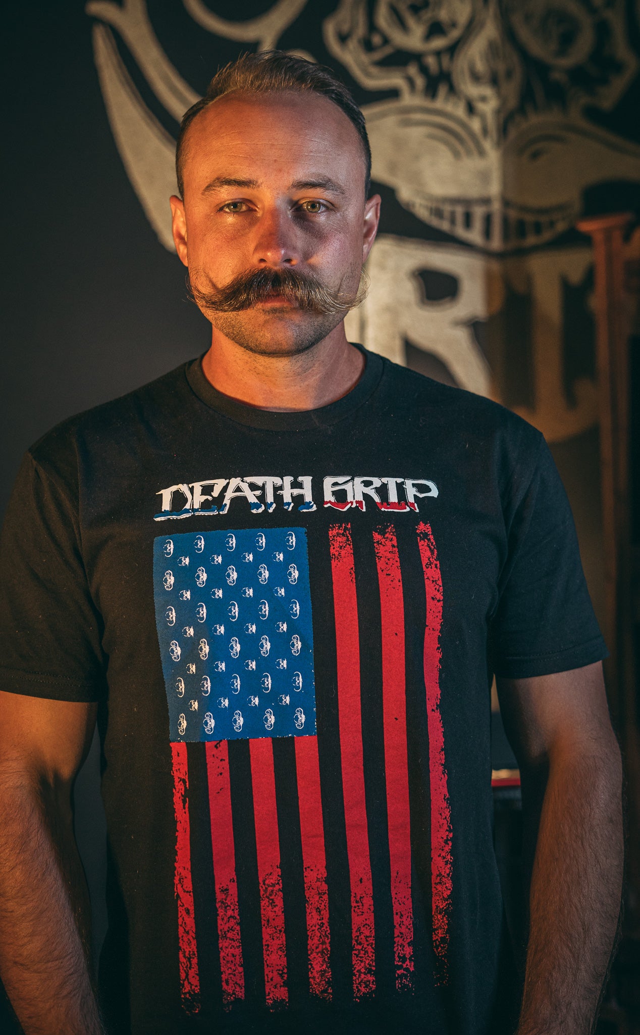 Featuring a bold American flag design fused with the iconic Death Grip logo, this shirt was made to turn heads—and twist whiskers. It’s everything you love about your mustache… just louder, prouder, and stitched into the fabric of freedom.