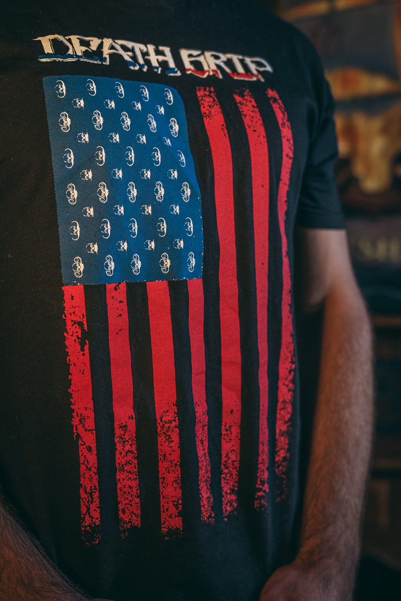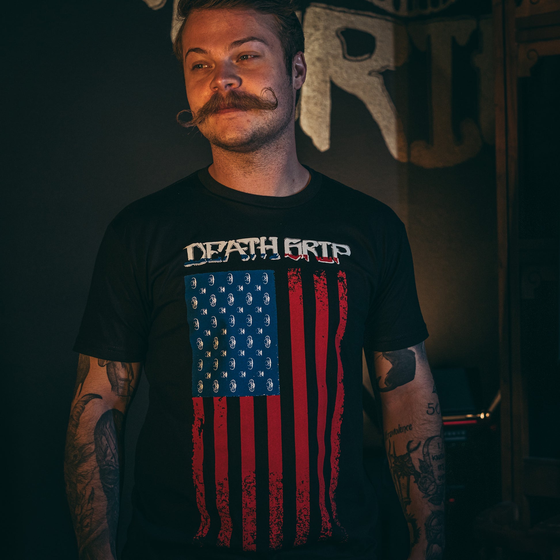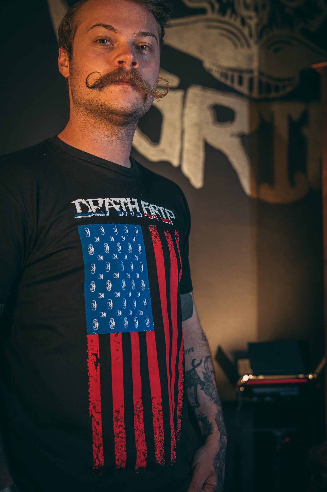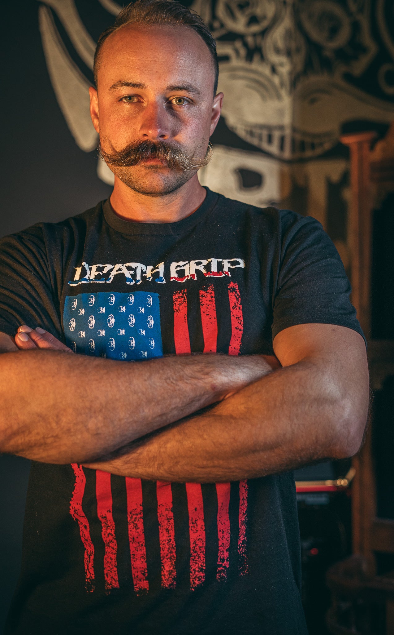 Featuring a bold American flag design fused with the iconic Death Grip logo, this shirt was made to turn heads—and twist whiskers. It’s everything you love about your mustache… just louder, prouder, and stitched into the fabric of freedom.