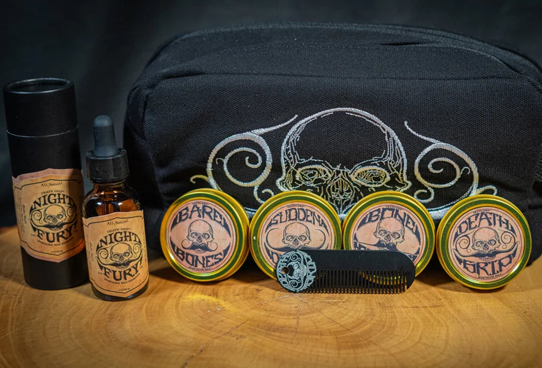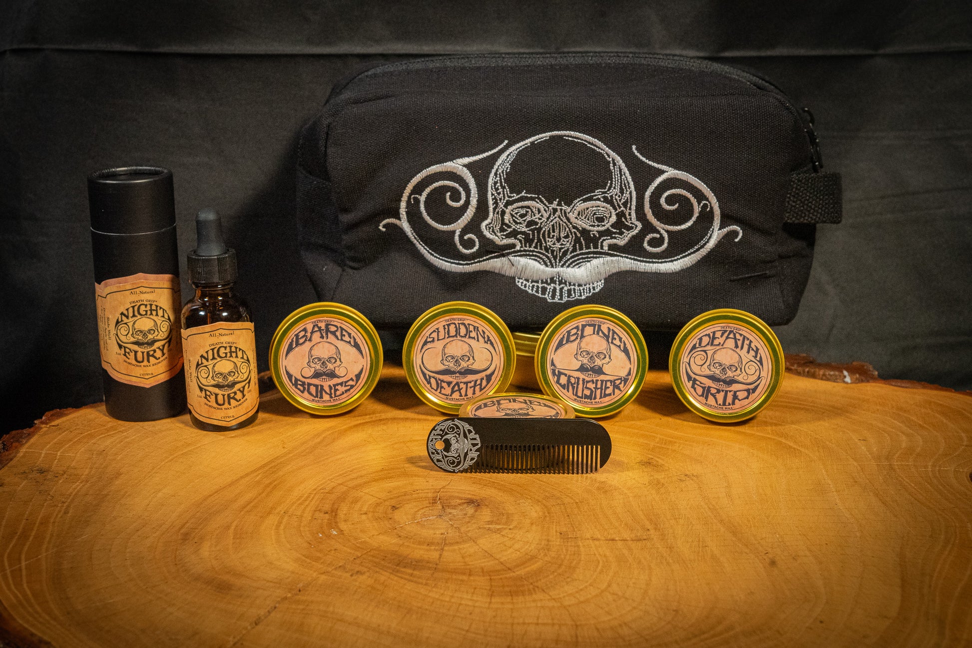 Everything you need for your mustache in one place! Introducing the ultimate mustache care kit, designed for the discerning gentleman who demands only the best for his facial hair. This comprehensive kit includes all four of our premium mustache waxes, a Pocket Comb, a bottle of Night Fury Mustache Wax Remover Oil, and our compact canvas travel kit. Whether you're aiming for a classic handlebar or experimenting with a bold new style, this kit has everything you need to keep your mustache looking sharp and well-groomed.