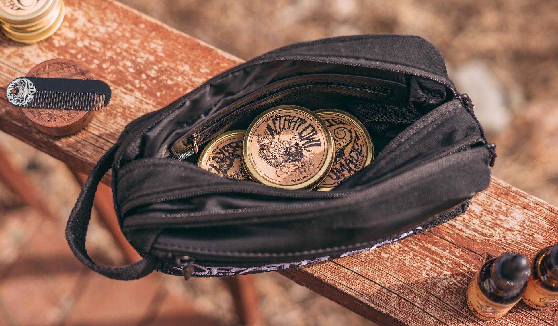 The Small Death Grip Travel Bag is the perfect solution for keeping all of your must-have grooming products organized and in one place. And with the convenience of being able to take it with you wherever you go, you'll never have to worry about forgetting something essential again. Whether you're a fan of handlebar mustache wax or just need a reliable place to store your hair styling products, this bag has got you covered.