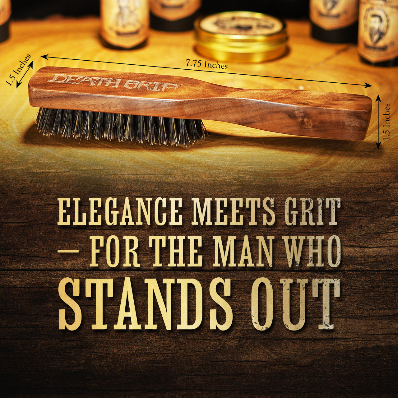 The Boar's Hair Bristle Wood Handheld Brush featuring the Death Grip text engraved logo also makes for an exquisite gift. Whether it's a birthday, anniversary, or just a token of appreciation, this brush is a thoughtful and unique present. Each time the recipient uses the brush, they'll be reminded of your care and consideration. With its stylish design and superior functionality, it's a gift that keeps on giving.